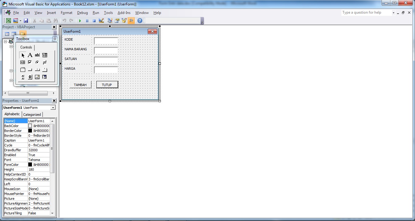 - Akan muncul VBA Project. Klik tab insert dan pilih UserForm.